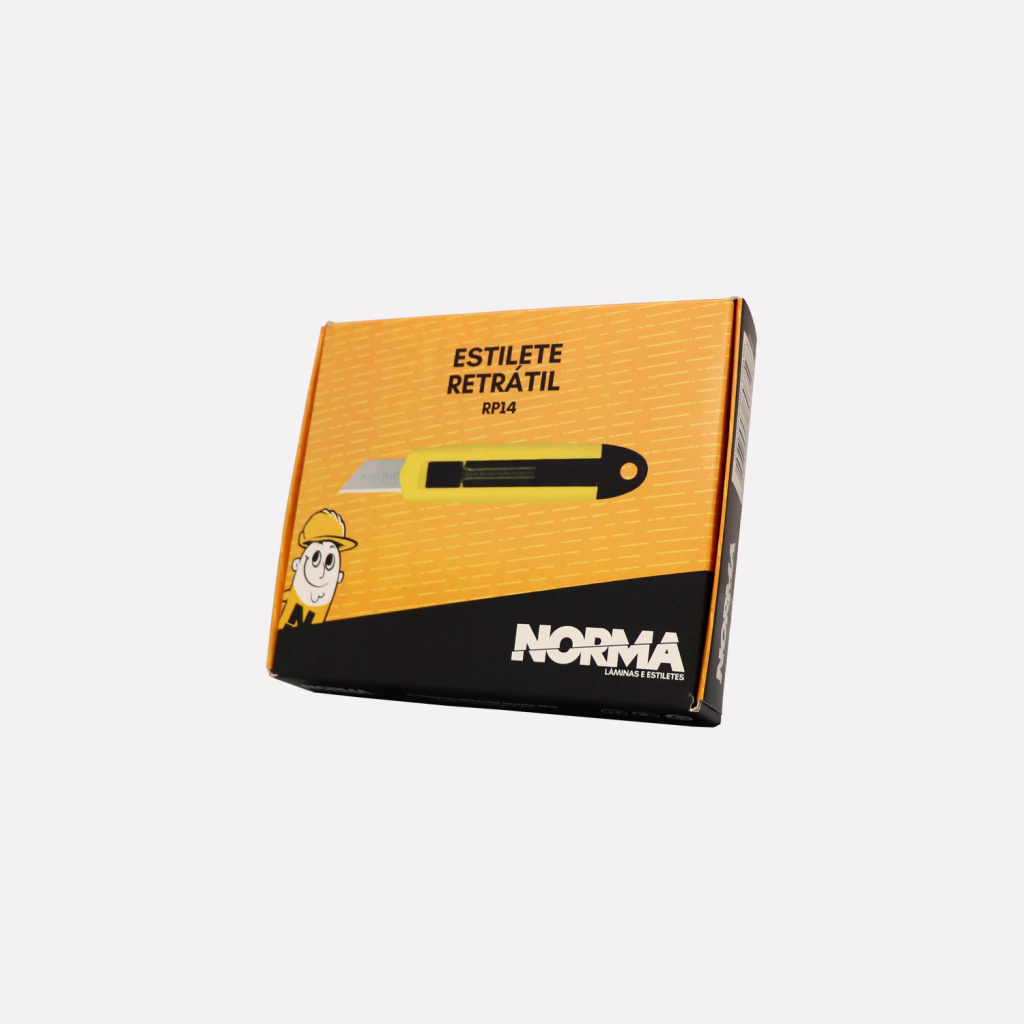 O Estilete de Segurança Retrátil Norma RP14, fabricado em termoplástico, é a nova versão do modelo RP04. Dentre as principais melhorias, destaca-se a função ambidestra, onde destros e canhotos conseguem utilizar o mesmo estilete. O formato ergonômico do estilete RP14 foi pensado cuidadosamente, de forma a se encaixar perfeitamente na mão do operador. Após o término do contato com a superfície de corte, a lâmina se retrai automaticamente, garantindo maior segurança. Possui a Lâmina Trapezoidal Estendida SK120, em aço carbono, com exposição de 4cm, o que possibilita o corte em materiais mais espessos. É recomendado para serviços leves e cortes precisos, como espuma, borracha, papel, papelão e bobinas. É indicado para a indústria e comércio em geral.