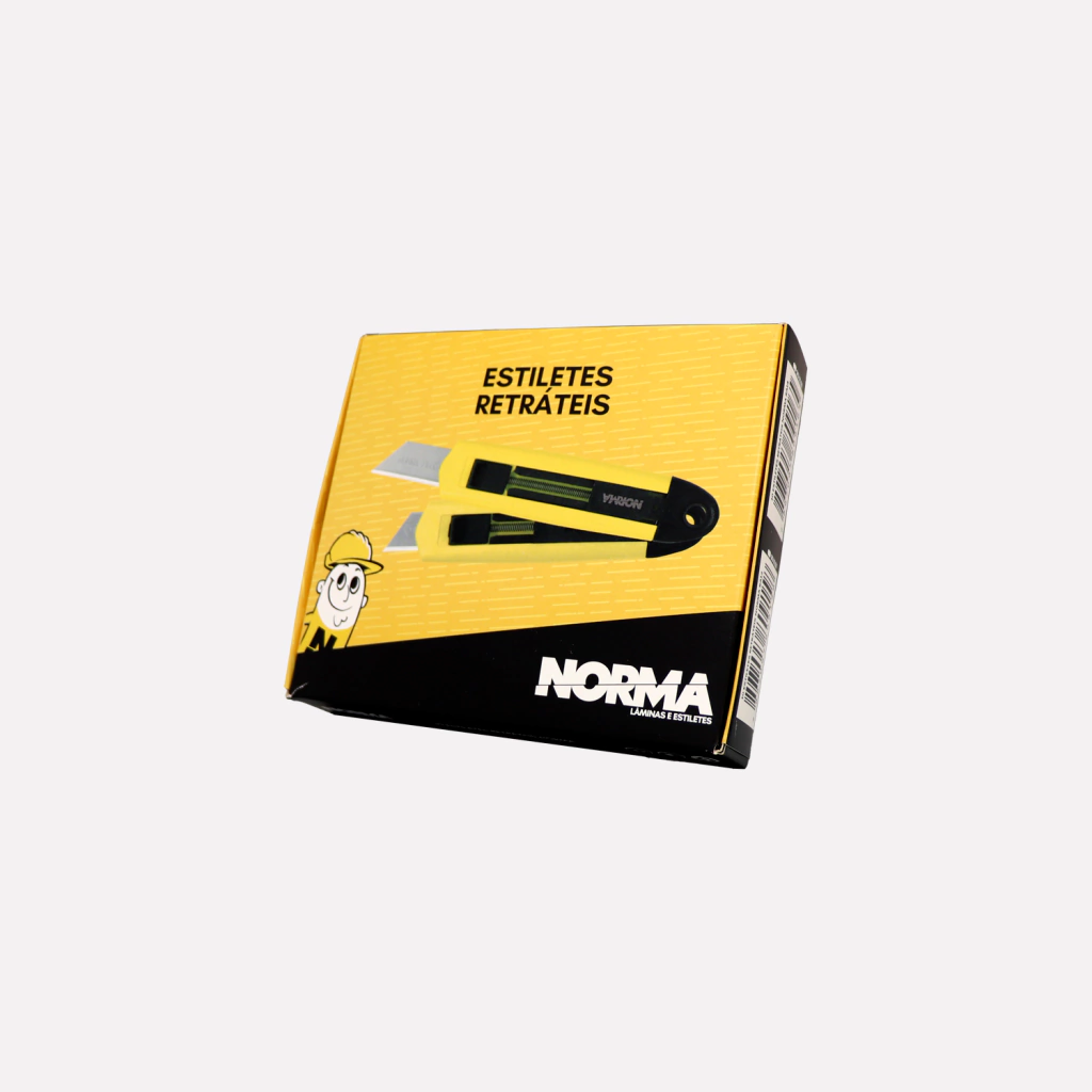 O Estilete de Segurança Retrátil Norma RA14, fabricado em alumínio injetado, é a evolução do estilete RA04. O diferencial do estilete RA14 é a função ambidestra, onde destros e canhotos podem utilizar o mesmo estilete. Possui retração automática da lâmina, após o término do contato com o objeto de corte, garantindo maior segurança. A estrutura reforçada e a Lâmina Trapezoidal Estendida SK120, em aço carbono, com exposição de 4cm, possibilitam a utilização em serviços pesados e em materiais espessos. É recomendado para cortes precisos, em materiais com piso vinílico, couro, borracha, papel, papelão, espuma, bobinas e filme metálico. É indicado para a indústria e comércio em geral.